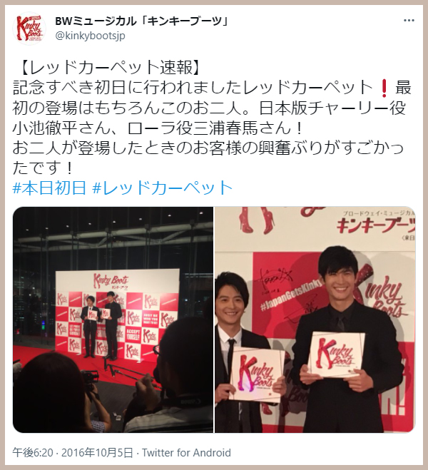 — BWミュージカル「キンキーブーツ」 (@kinkybootsjp) 2016年10月5日