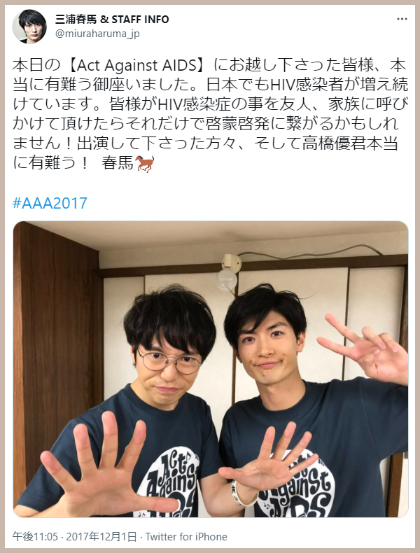 本日の【Act Against AIDS】にお越し下さった皆様、本当に有難う御座いました。日本でもHIV感染者が増え続けています。皆様がHIV感染症の事を友人、家族に呼びかけて頂けたらそれだけで啓蒙啓発に繋がるかもしれません!出演して下さった方々、そして高橋優君本当に有難う! 春馬🐎#AAA2017 pic.twitter.com/bi143UEVYv